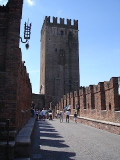 Den medeltida Ponte Scaligero utgör tillsammans med Castelvecchio en imponerande befästning som i modern tid pietetsfullt omvandlats till ett intagande museum. (Jag återkommer till museet). Bron var tänkt som en sista säker flyktväg norrut i händelse av att de veronesiska härskarna (familjen Scaligero) inte skulle kunna försvara sig mot angrepp utifrån eller kupper inifrån. Andra Scaligero-borgar finns bland annat i Sirmione och Malcesine vid Gardasjön.
